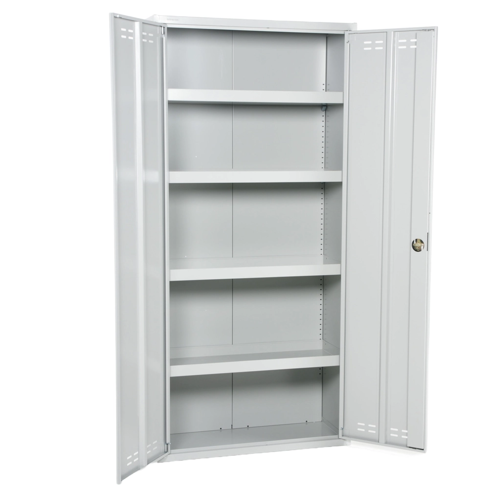 Stöðugur stálskápur með hillum með háum köntum sem hjálpa til við að koma í veg fyrir að efnaleki berist út.
